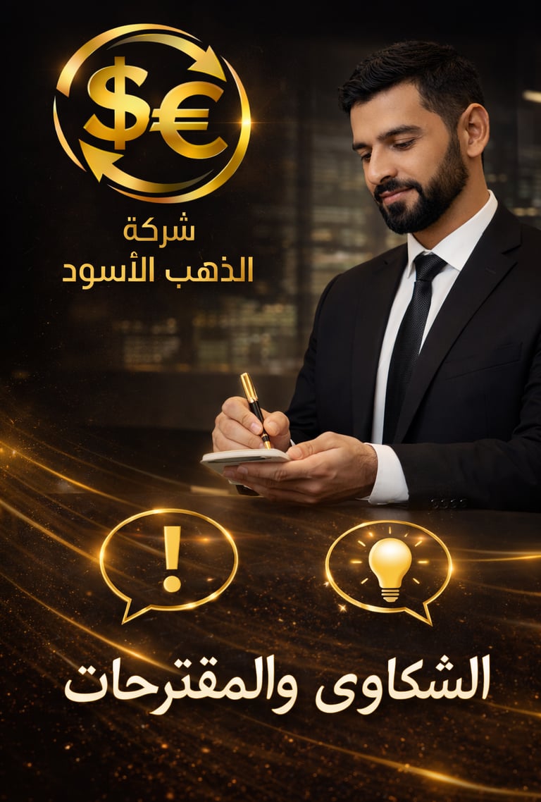 نرحّب بجميع شكاواكم ومقترحاتكم في شركة الذهب الأسود للتوسط ببيع وشراء العملات الأجنبية، فملاحظاتكم محل اهتمامنا وتسهم في تطوير خدماتنا وتحسين جودة أدائنا باستمرار.
