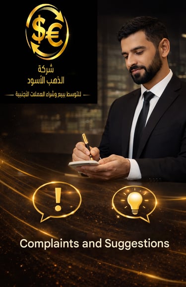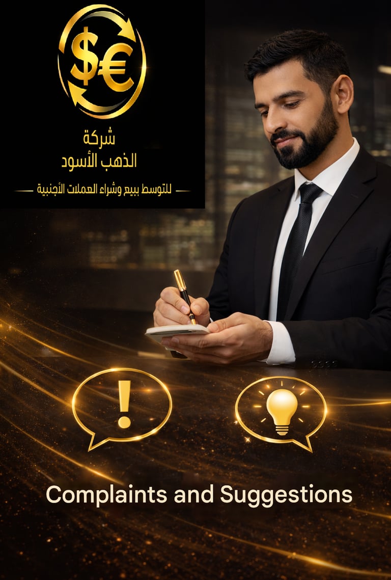 We welcome all your complaints and suggestions at Al-Dhahab Al-Aswad Brokerage Company for Foreign Currency Trading, as your feedback is important to us and helps improve our services and continually enhance the quality of our performance.